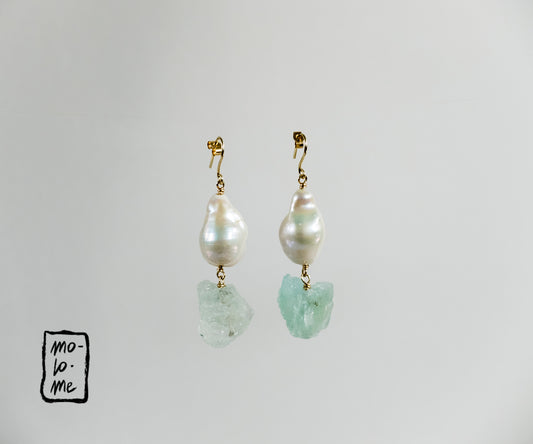 Rough Aquamarine and Baroque Pearl Drop Earrings