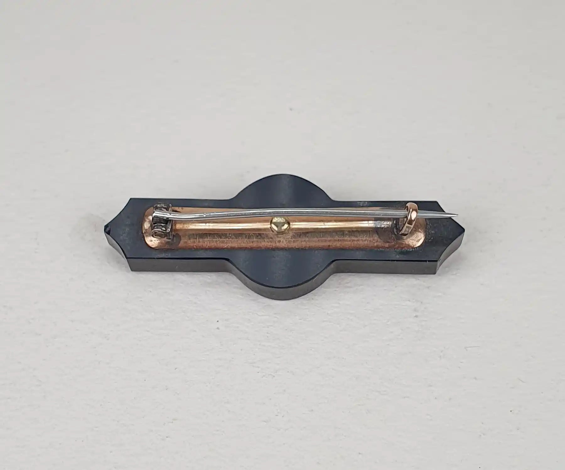 Incredibly elegant brooch featuring a carved Whitby Jet and set with 9ct gold insert set with five seed pearls.