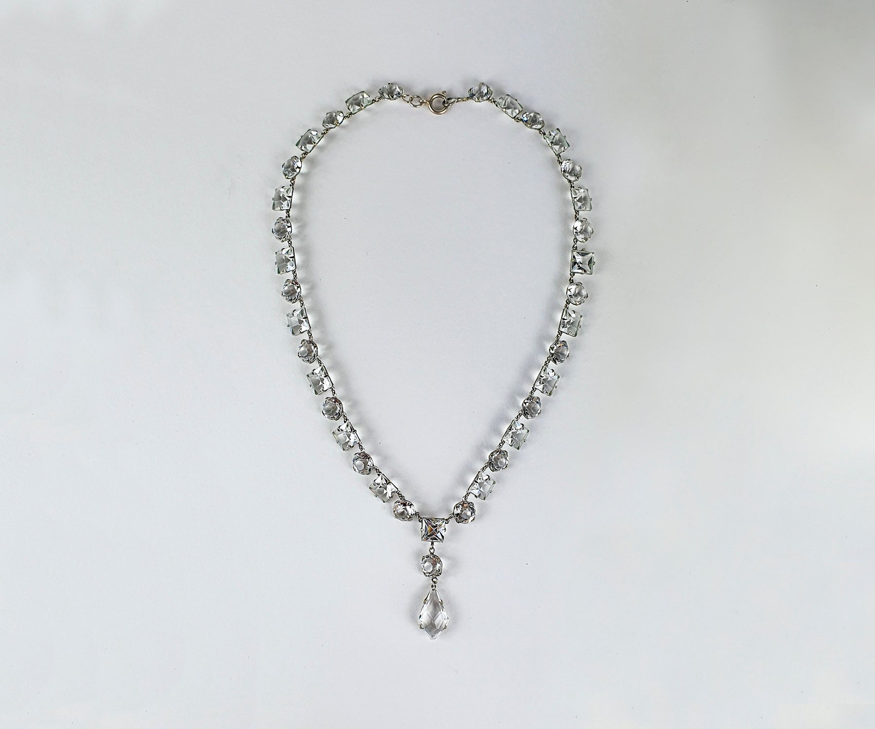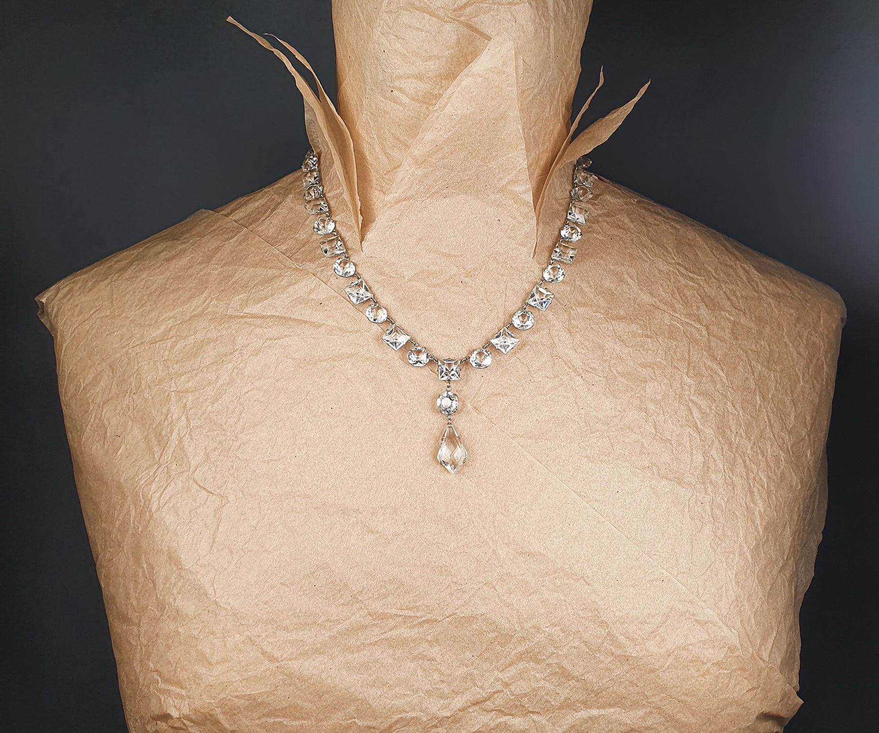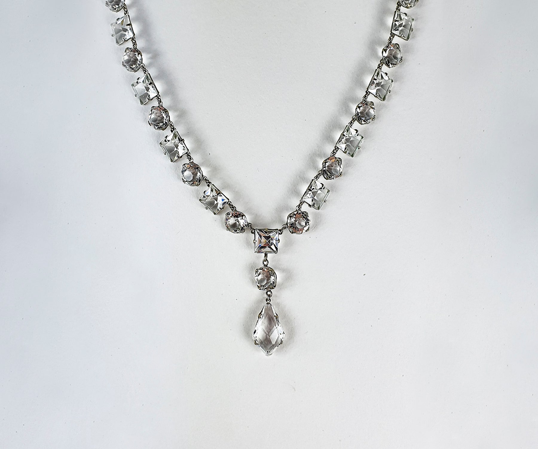 Gorgeous evening riviere necklace comprised of round and square cut paste stone with added drop pendant in the middle.