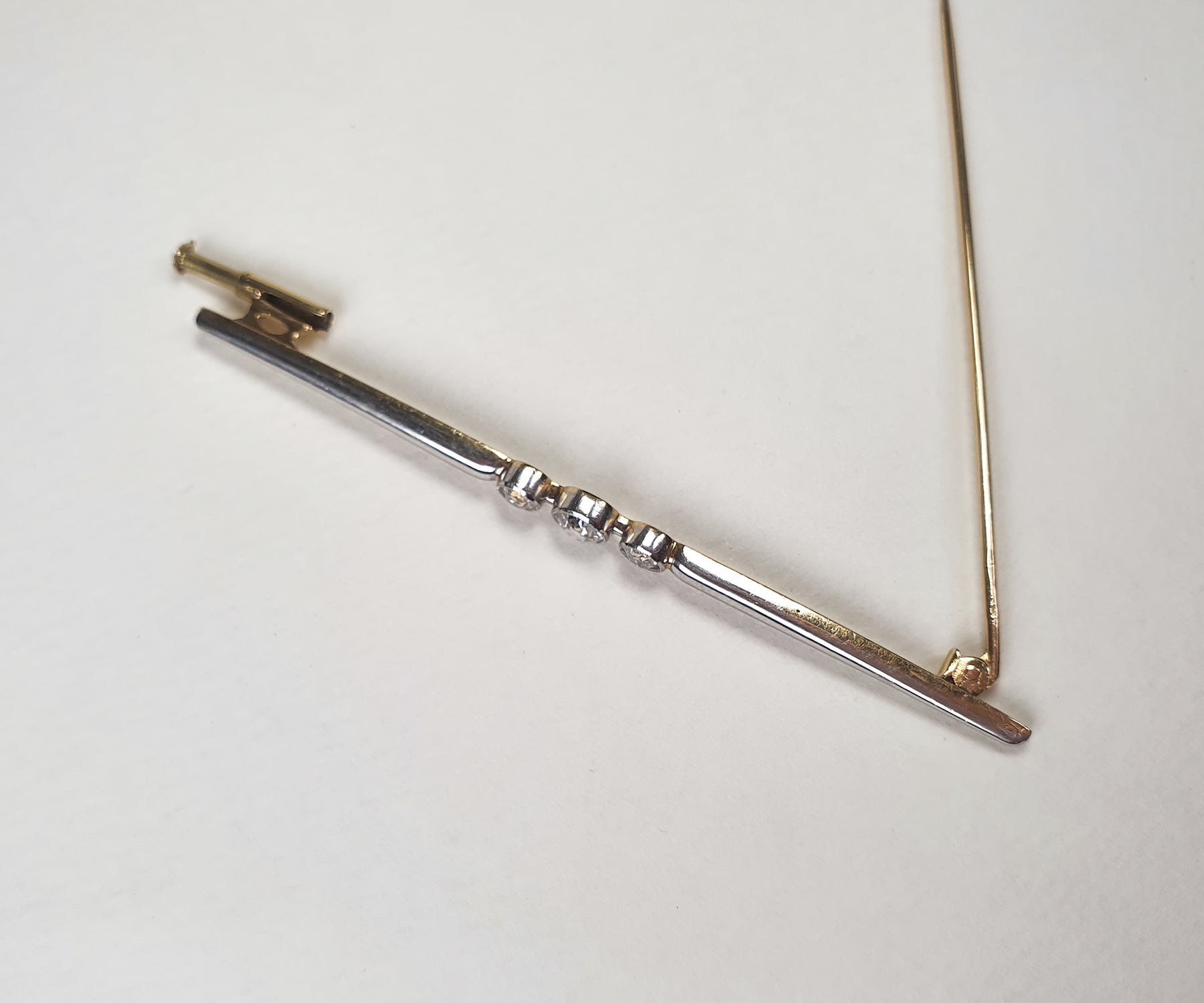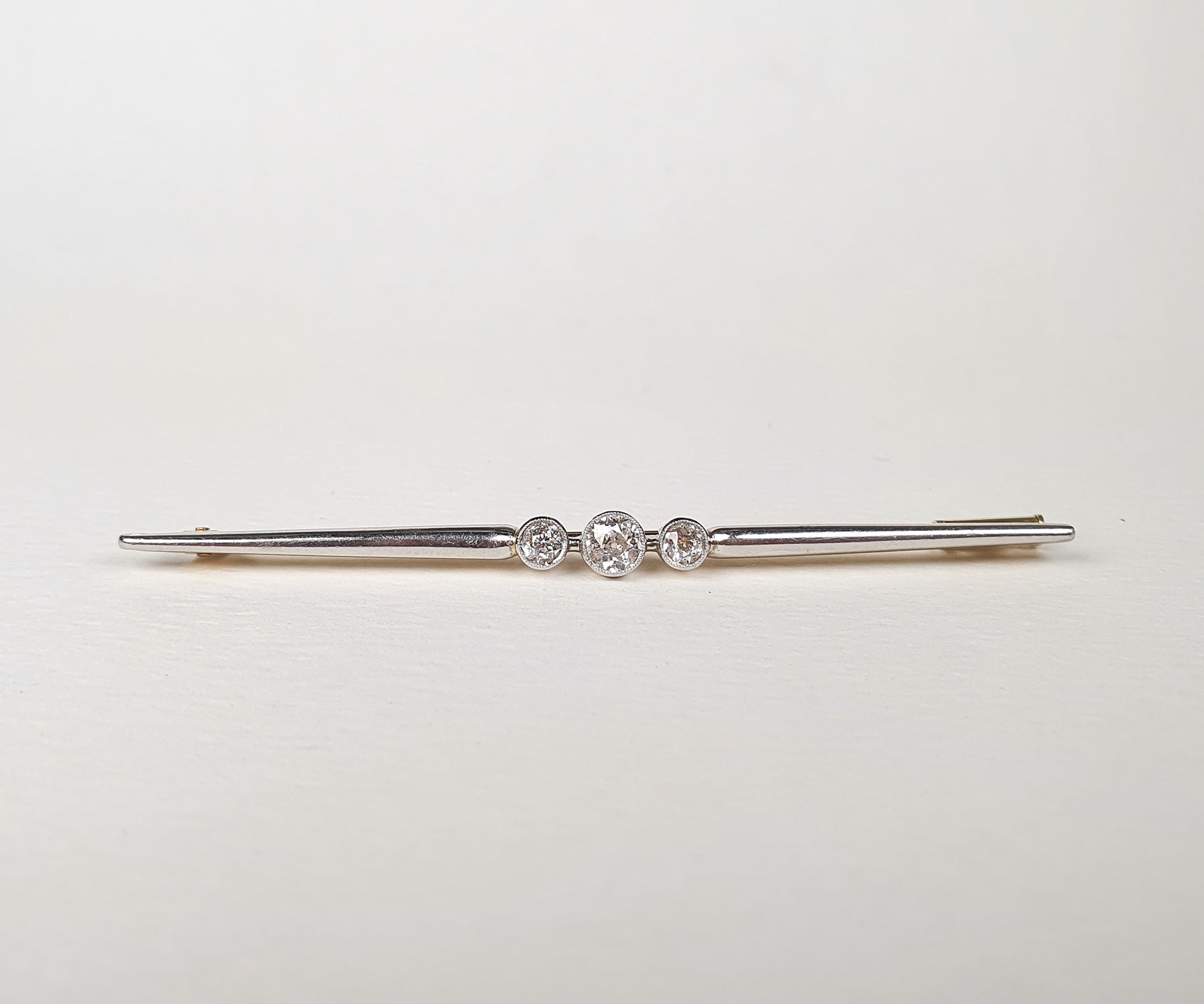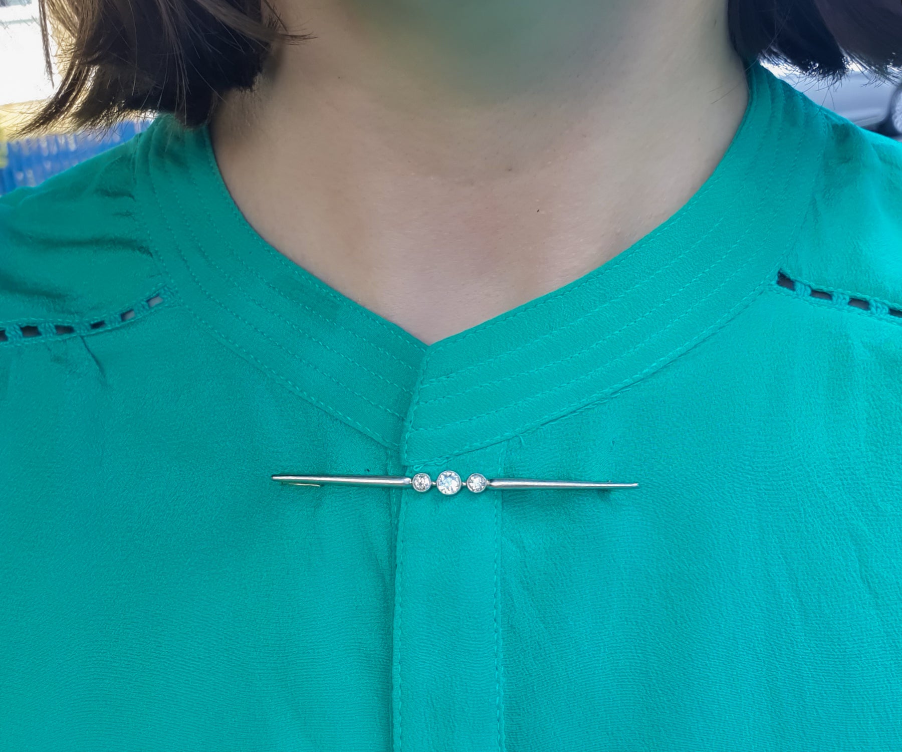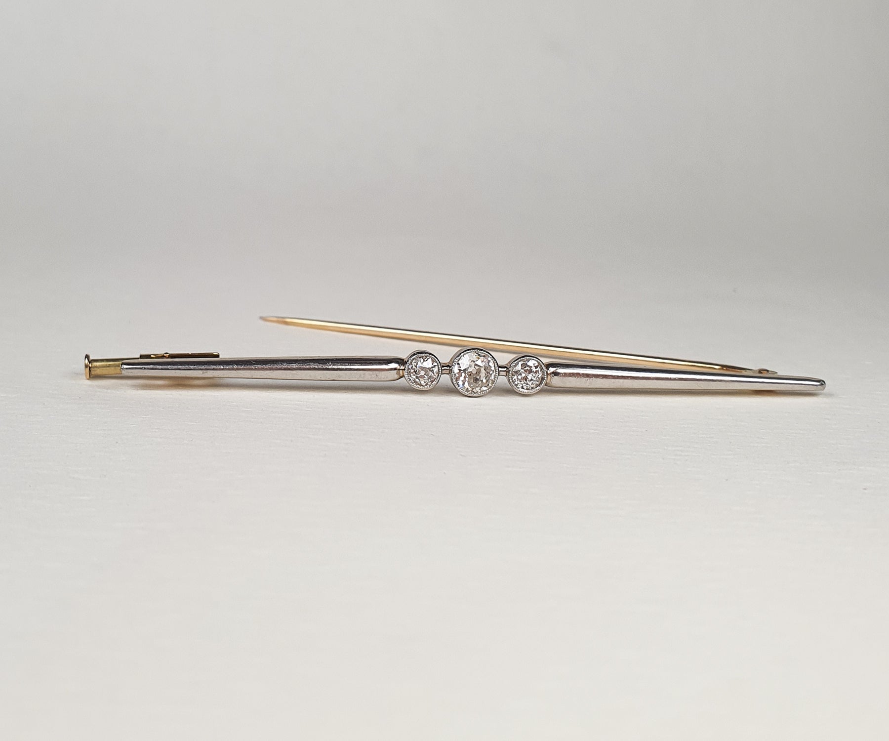 This one is a piece of art - the most stunning simple brooch design with striking torpedo-shaped bars connected to a three-diamond centre. The old cut diamonds are set in mille-grained bezel settings - a typical Art Deco feature.