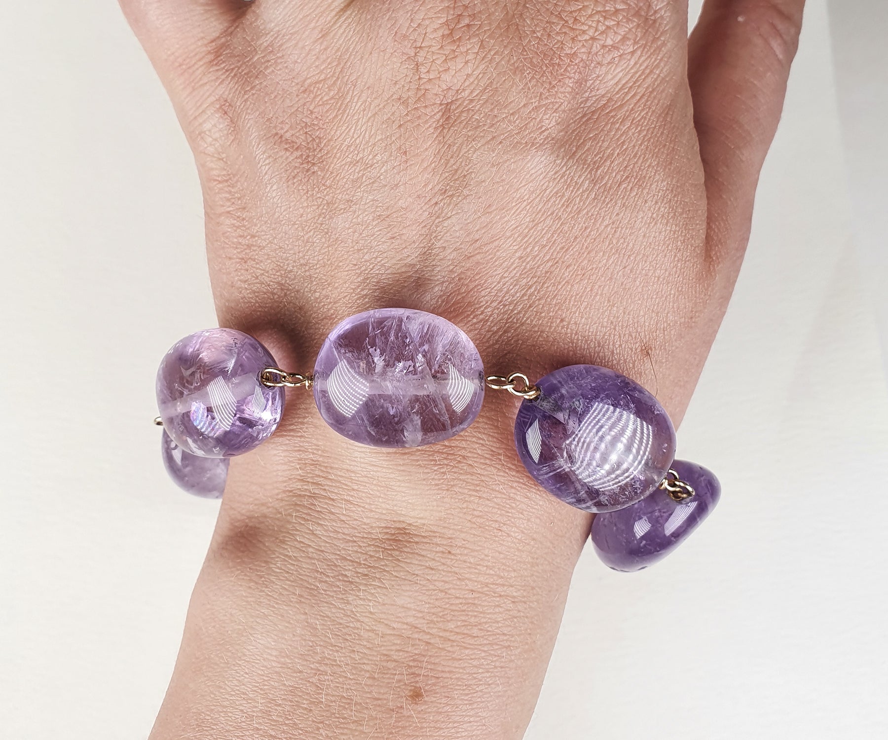 Incredible weighty bracelet that uses natural big smooth amethyst beads and single contrasting in colour, shape and size single citrine bead. Completed with a large round ball clasp, this bracelet is the ultimate statement accessory. There is something very calming and refreshing