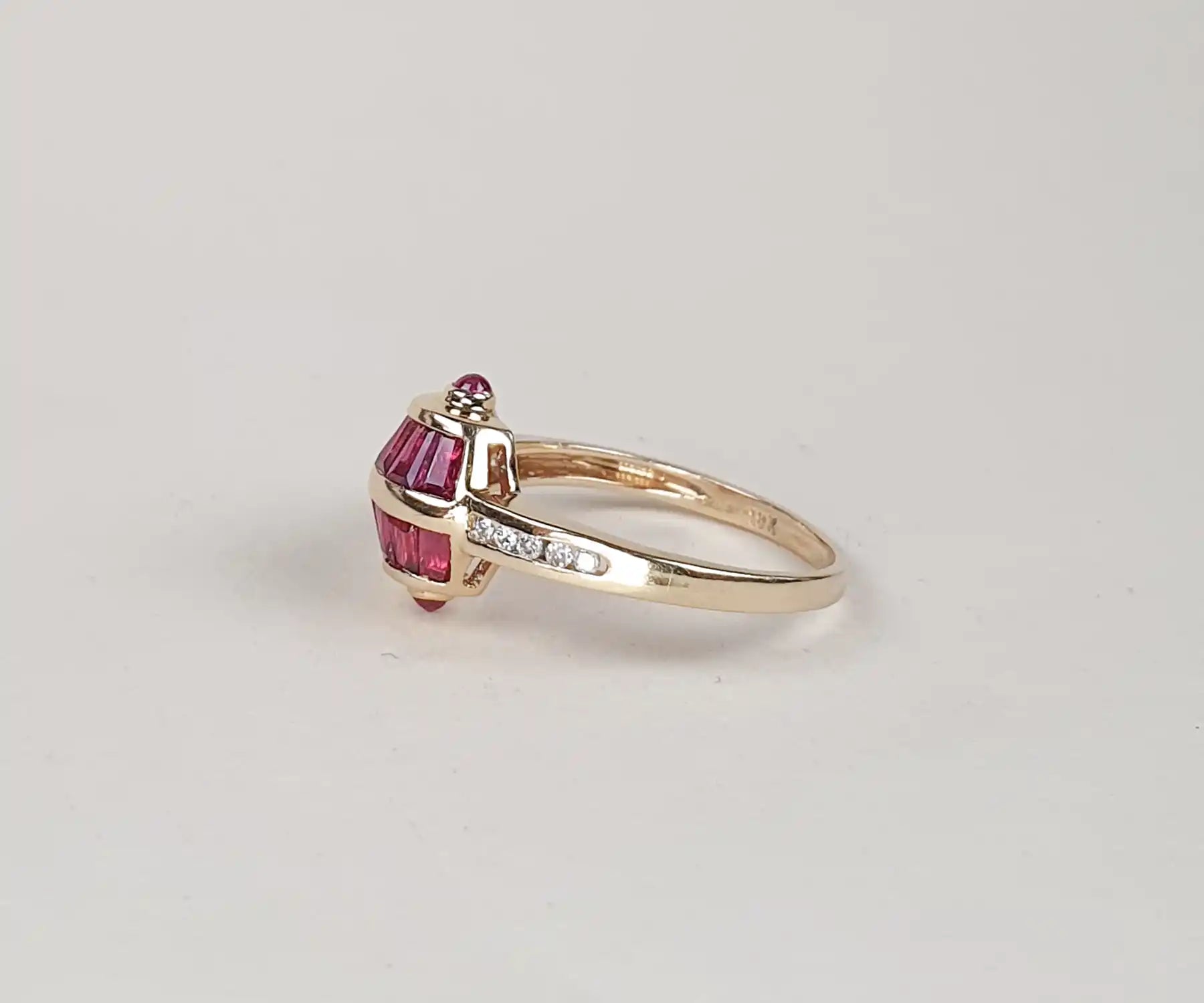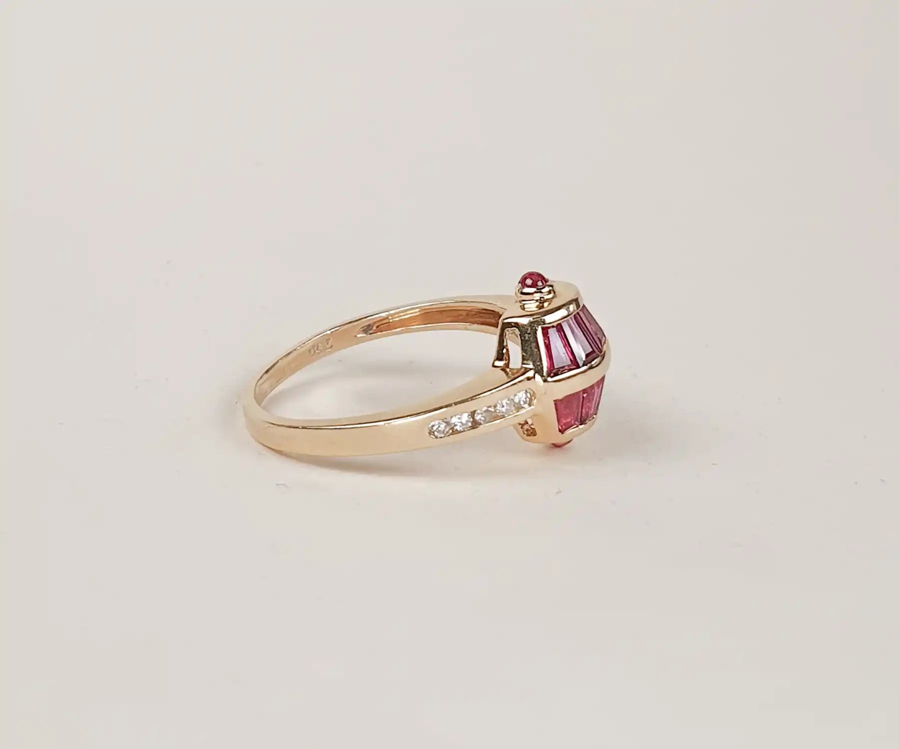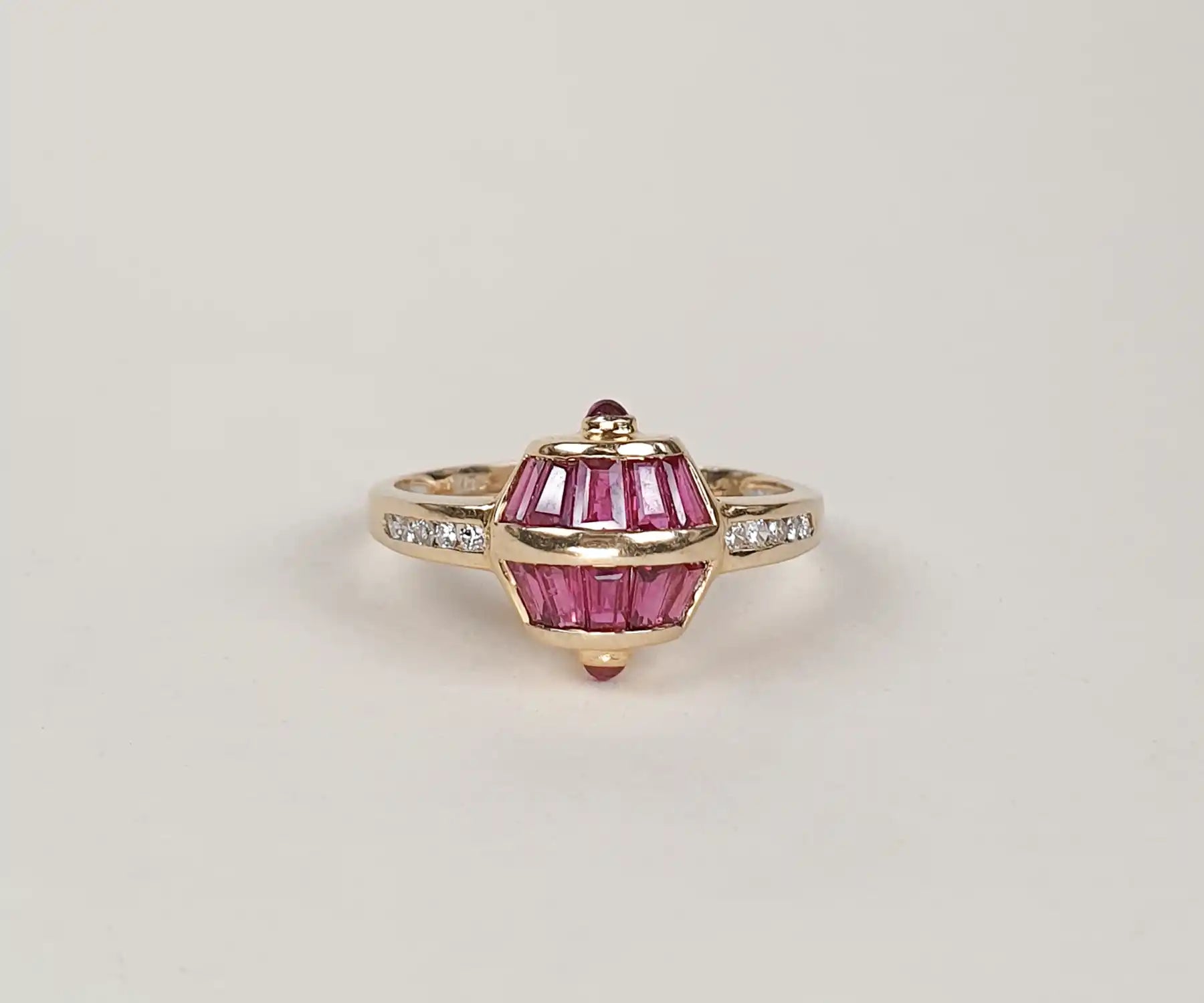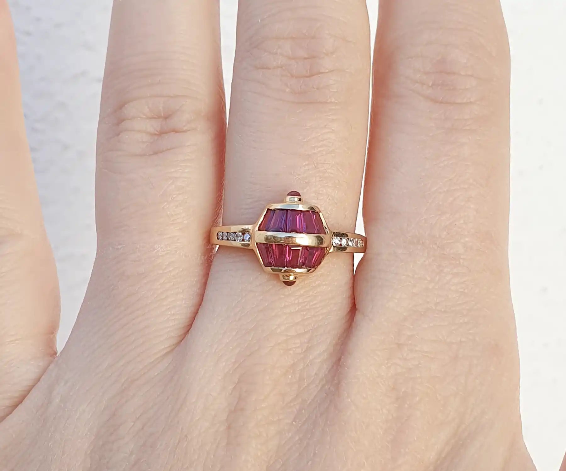 The ingenious design of this one-of-a-kind ring reminds me of an 80s space satellite with its cylindrical shape and side antennae. The crown is channel set with calibre-cut rubies and two tiny ruby cabochons - apart from the incredible ruby colour, the sparkle on that ring is something else. The shoulders feature round brilliant cut diamonds, also set in channel settings. I have never seen anything like it