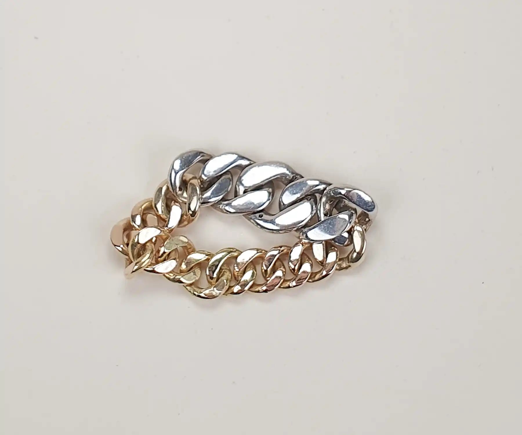 Made in mixed 18-carat yellow gold, the white gold is on top and set with single-cut diamonds, the yellow gold makes up the rest of the ring. The link graduation is simply delicious. Parting with this ring will be the most painful in my entire history of jewellery selling and making.