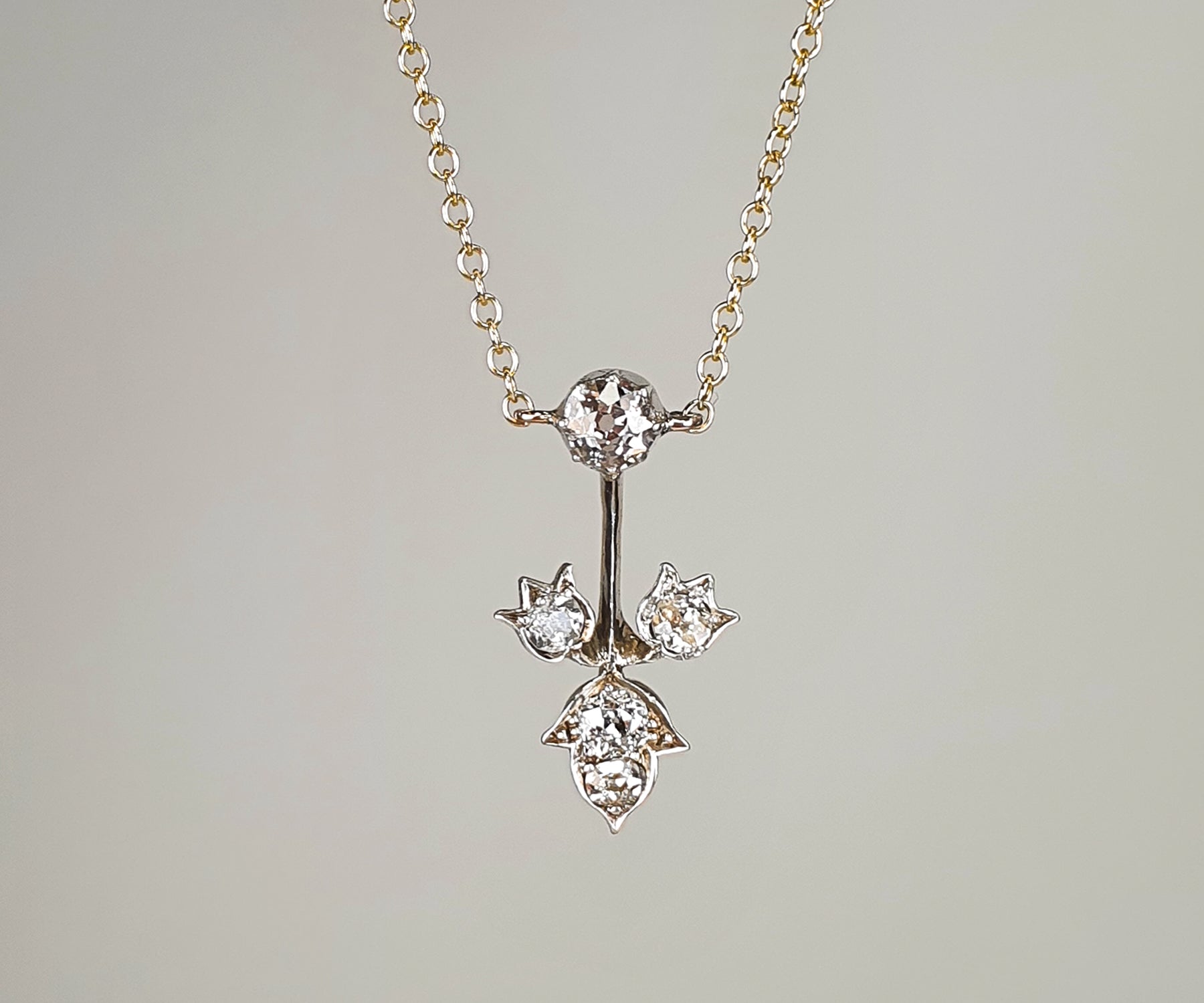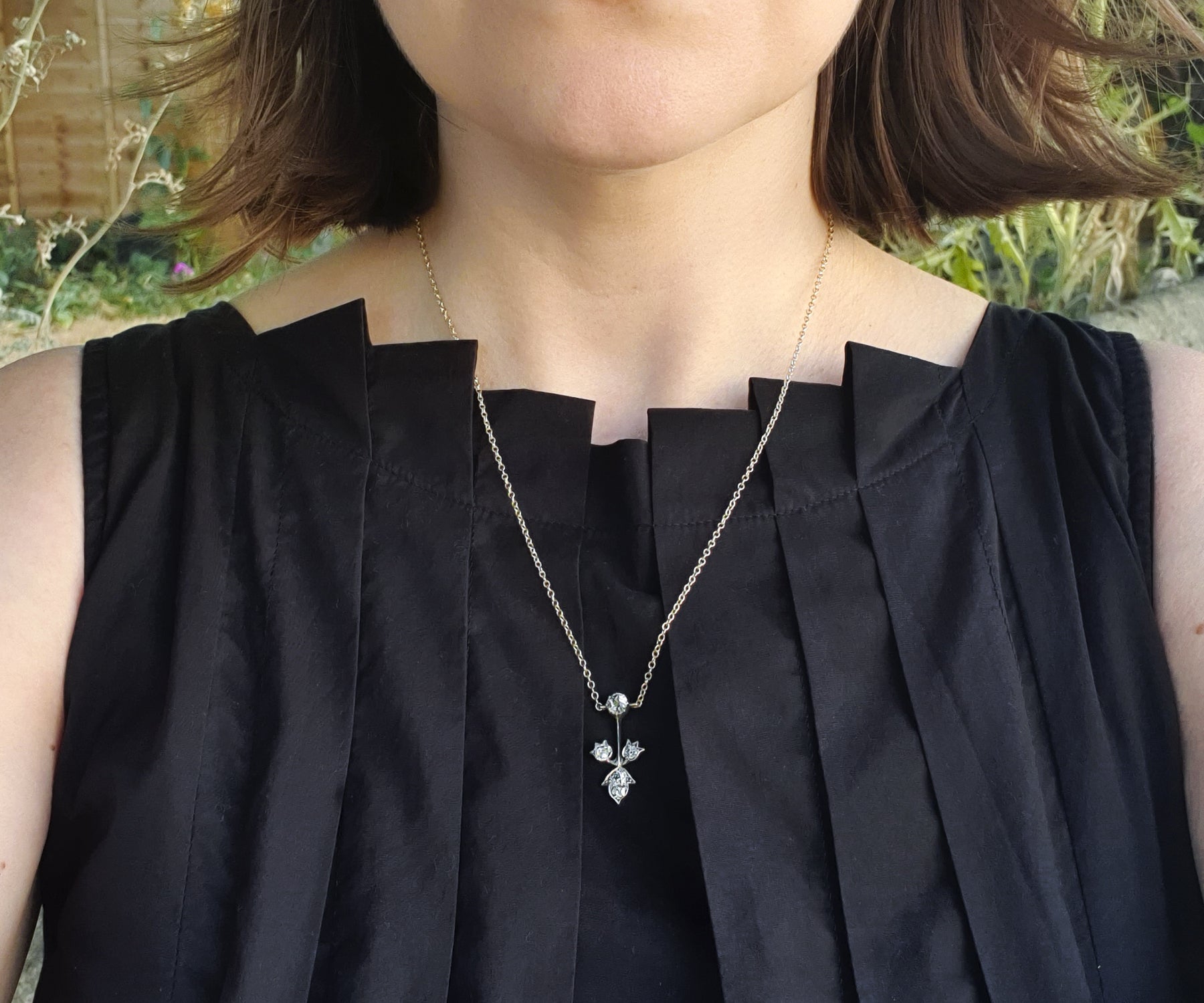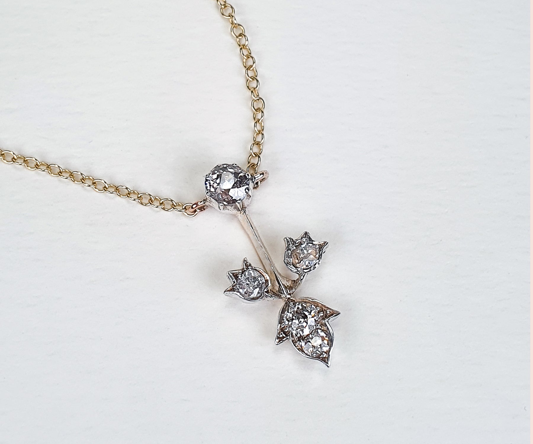 This silver set piece features five old cut diamonds in a typical Victorian naturalist motif - leaf and flowers. The pendant is suspended from a new 9ct gold cable chain, and it is in a fixed position. The diamonds are of various sizes - the largest 5mm in diameter, unlike the rest of the diamond is set in a cut down collet. The pendant also features a typical Victorian knife-wire that gives the impression of floral arrangement being suspended in the air.