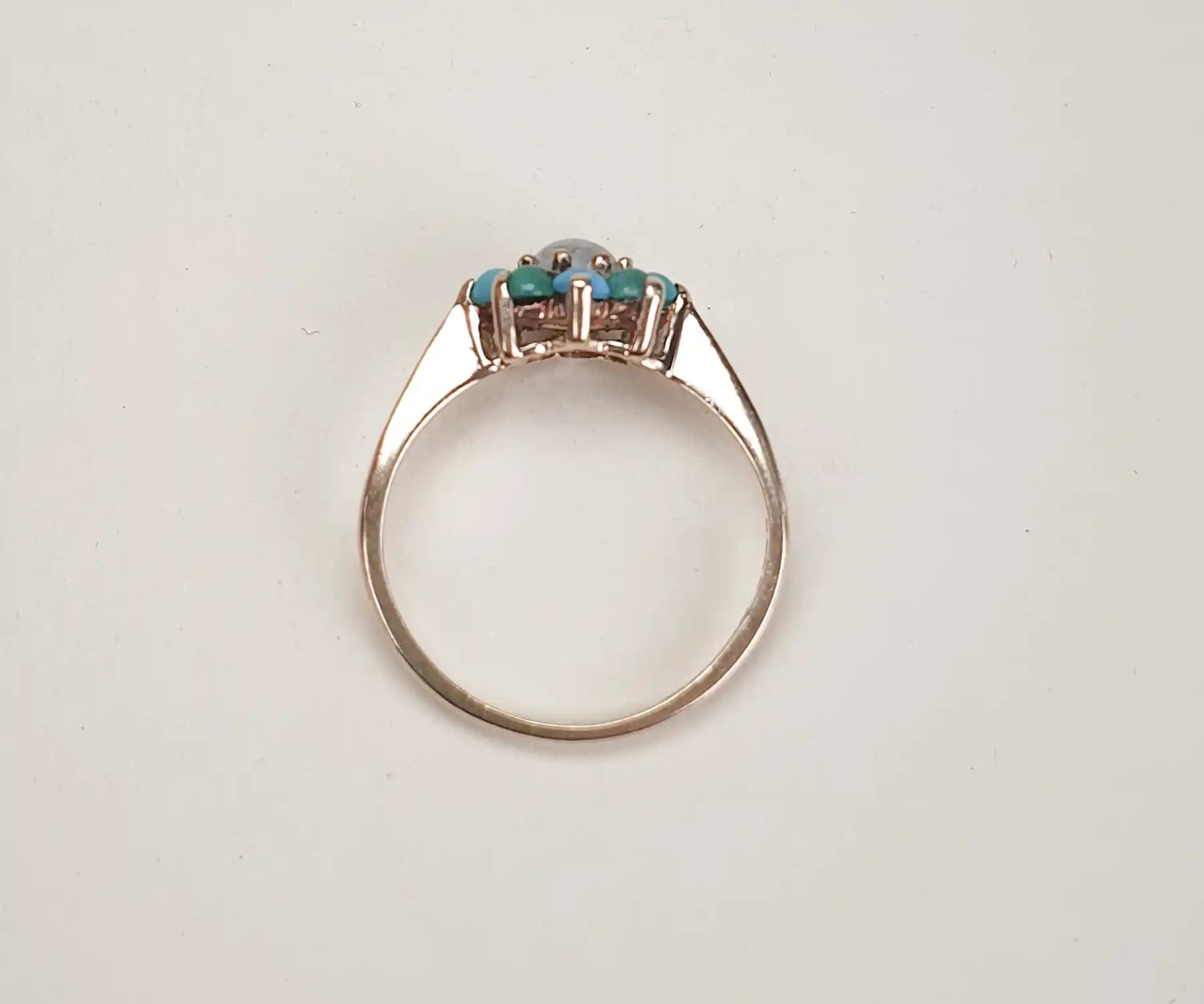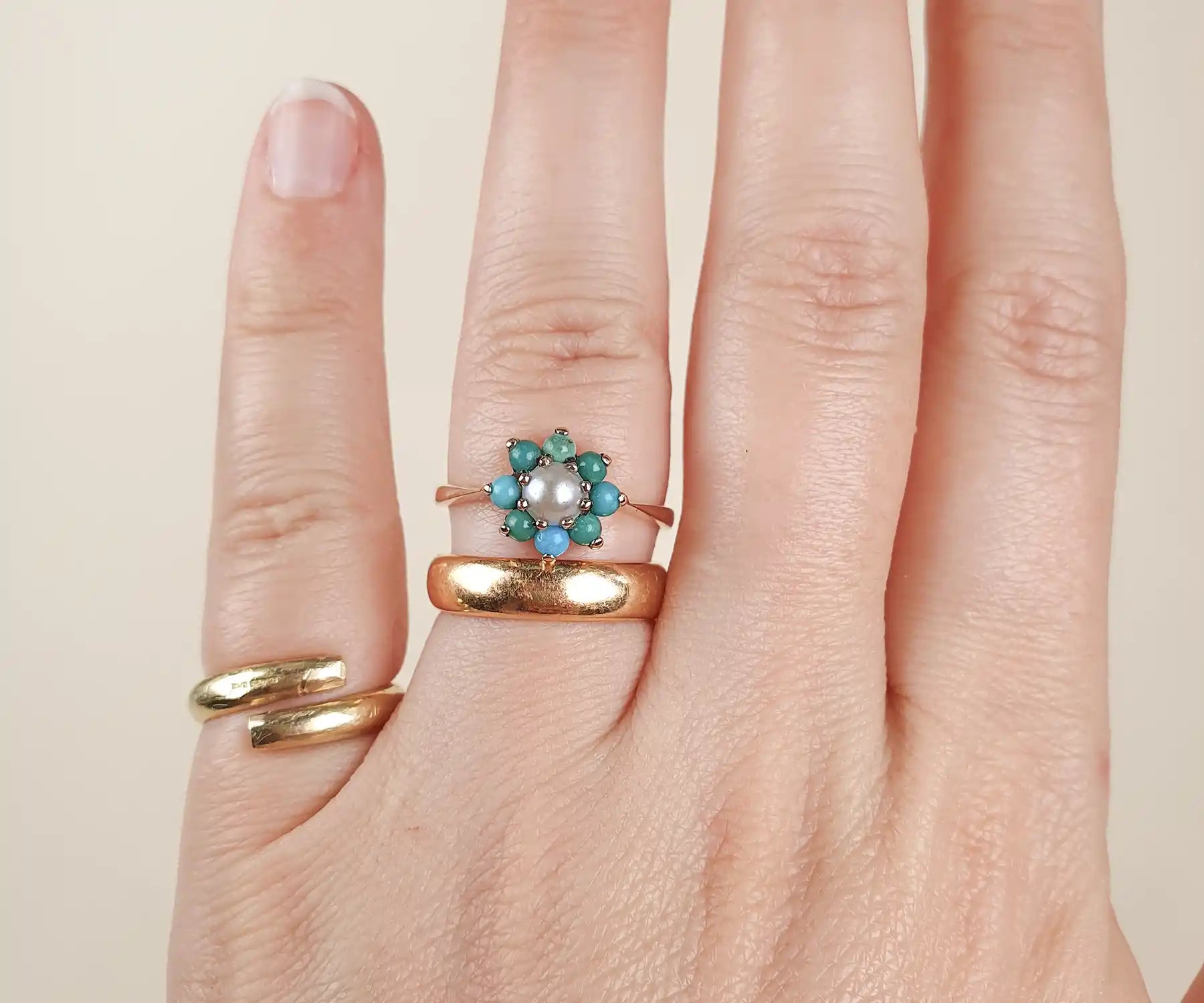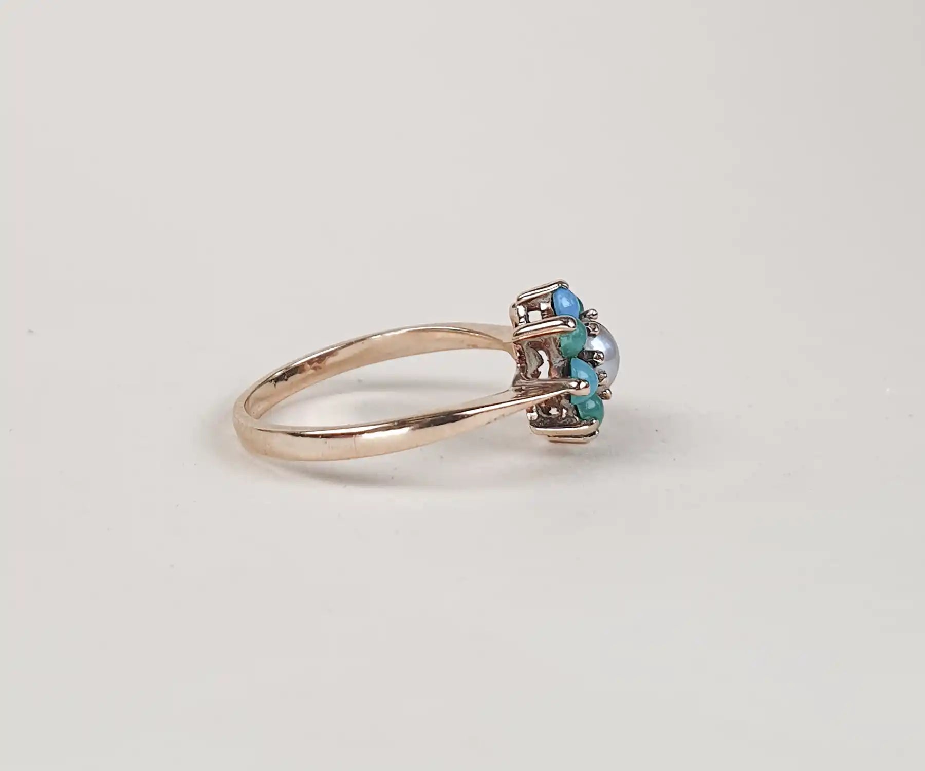 Gorgeous forget-me-not ring featuring natural small turquoise cabochons and a white pearl centre. This ring is everything!