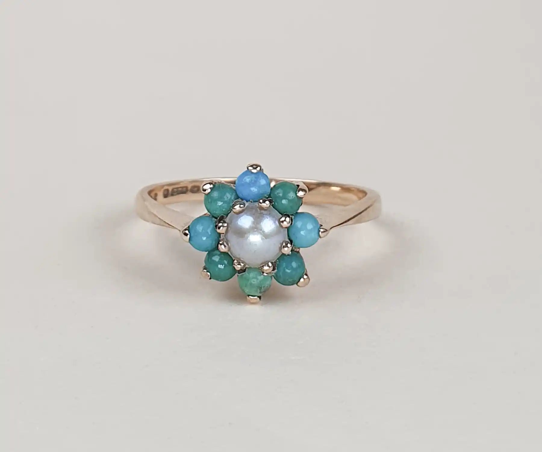 Forget Me Not Turquoise and Pearl Vintage Ring in Yellow Gold