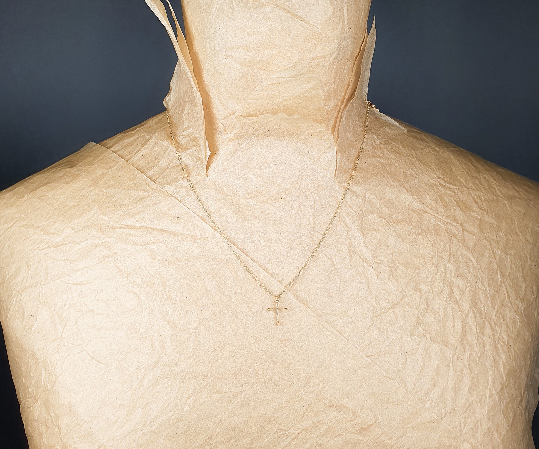 Delicate handmade cross pendant suspended from a fine cable chain. Part of Kleks collection which draws inspiration from flowing water. Each pendant is ever so slightly different from another. Ideal christening gift!