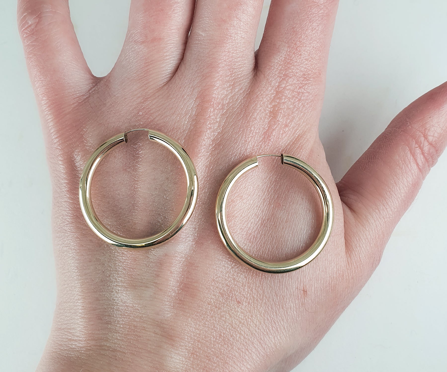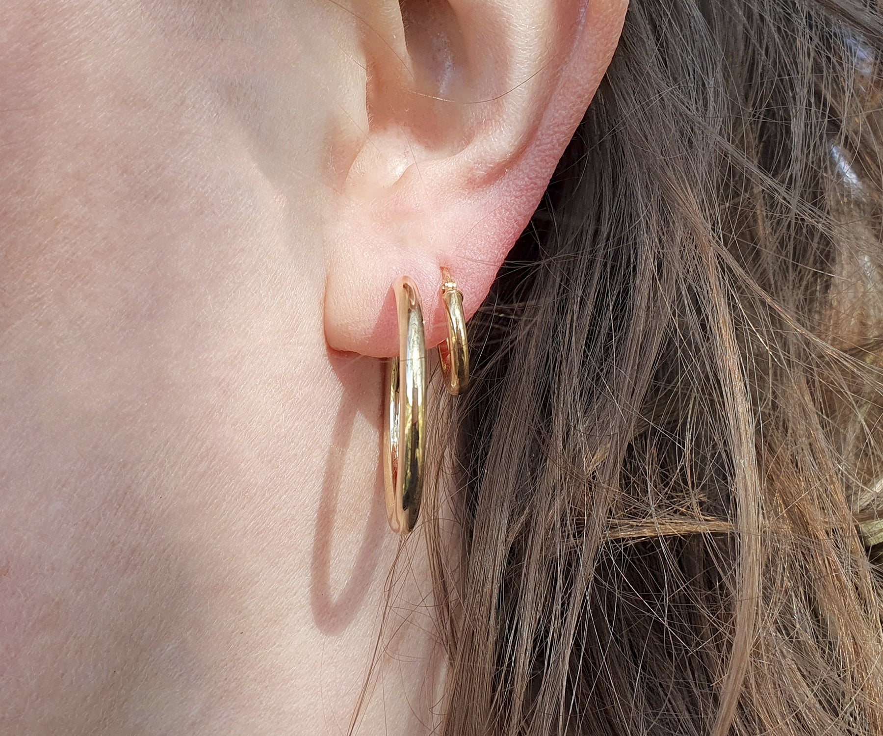 Fantastic, simple everyday hoops made of 9ct yellow gold. These thick but super light hoops are an accessory staple that everyone should have! Made of 3mm tube that's that gives it a chunky look.