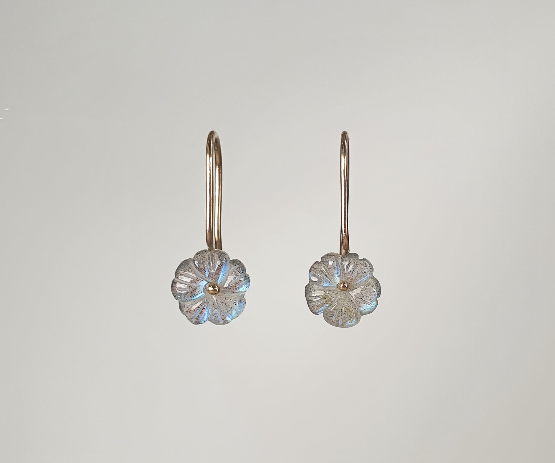 One of a kind, beautiful drop earrings featuring carved labradorite flowers with incredible blue flash! Suspended from Single Mine Origin 9ct gold.