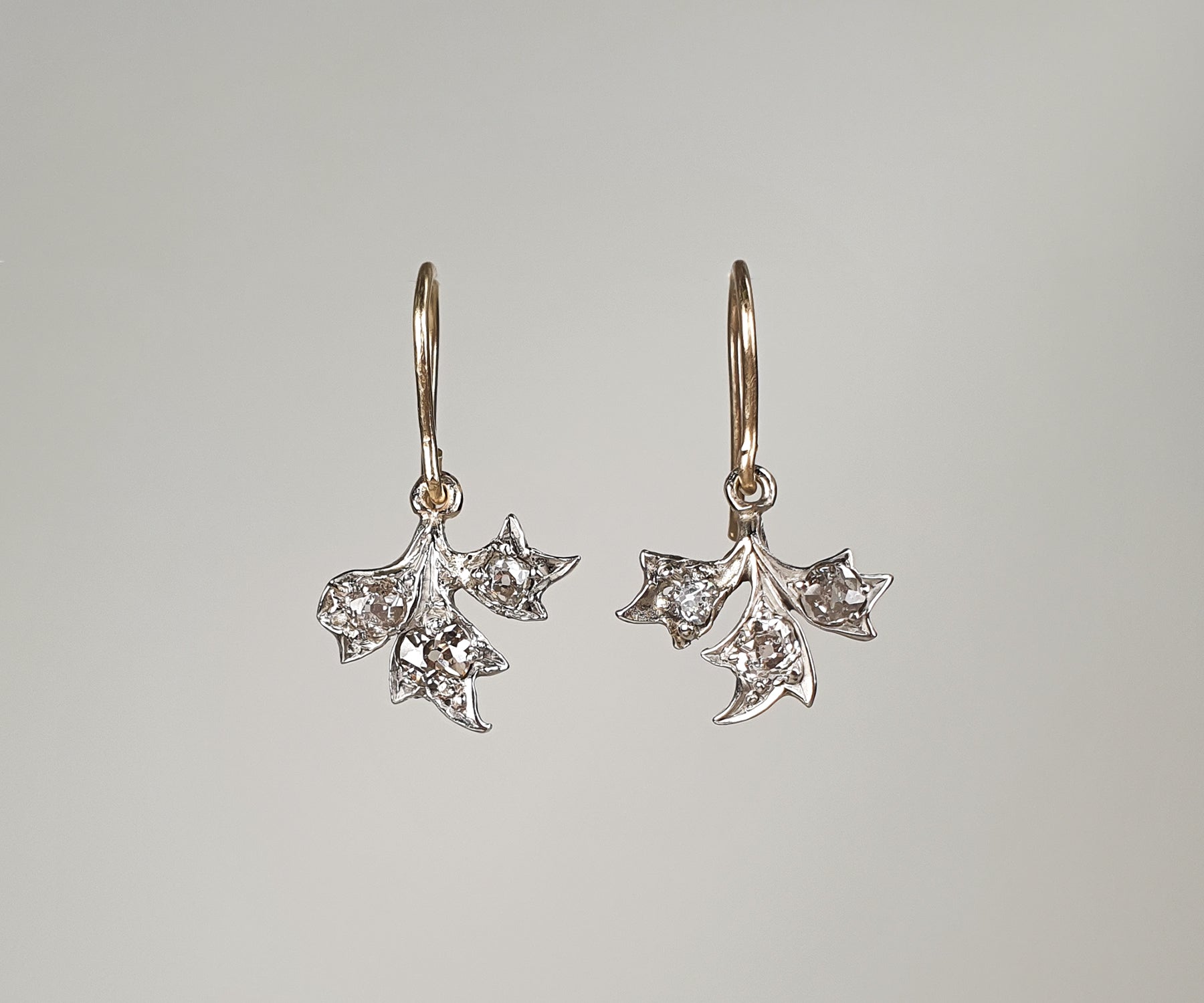 Gorgeous remodelled leaf motif earrings featuring six sparkly old cut diamonds, suspended from new 9ct Single Mine Origin gold hooks.