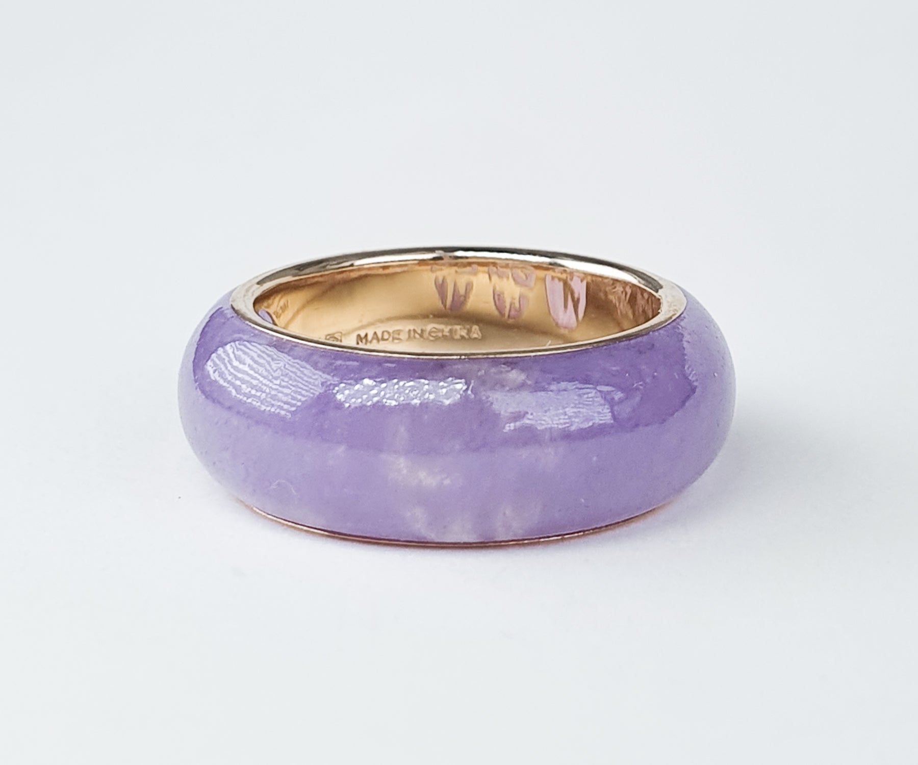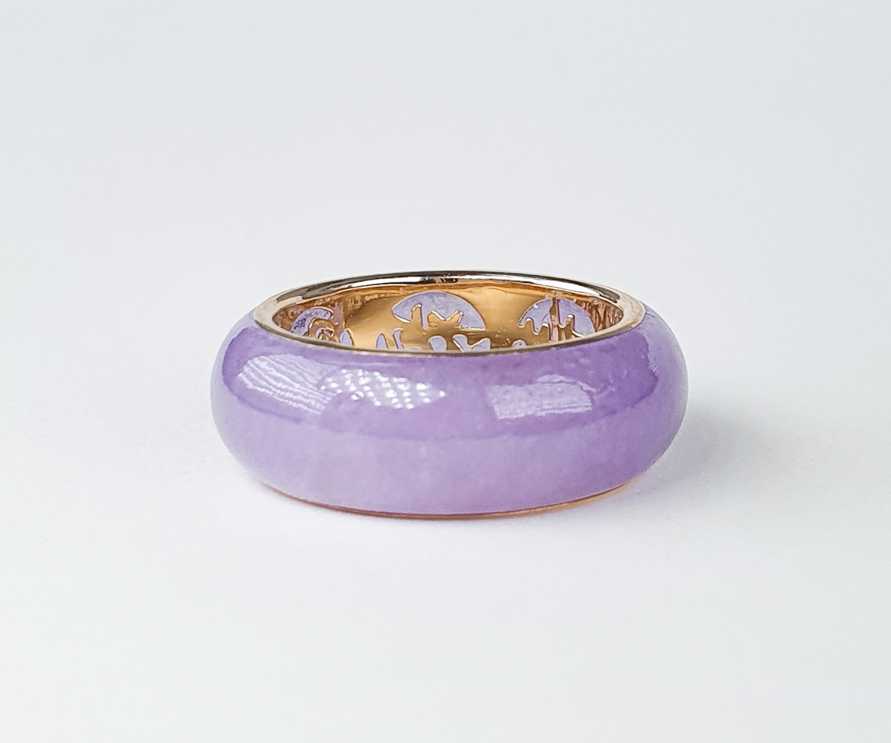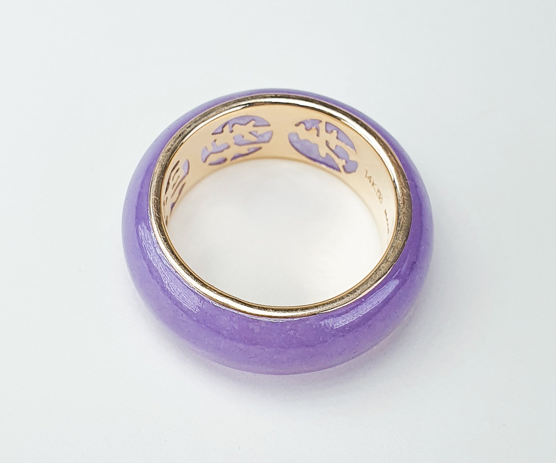 Unusual jadeite hololith ring made from one piece lavender jadeite lined on the inside with a gold band that contains Chinese symbols of good luck, wealth and long life. Will work well as a pendant too!