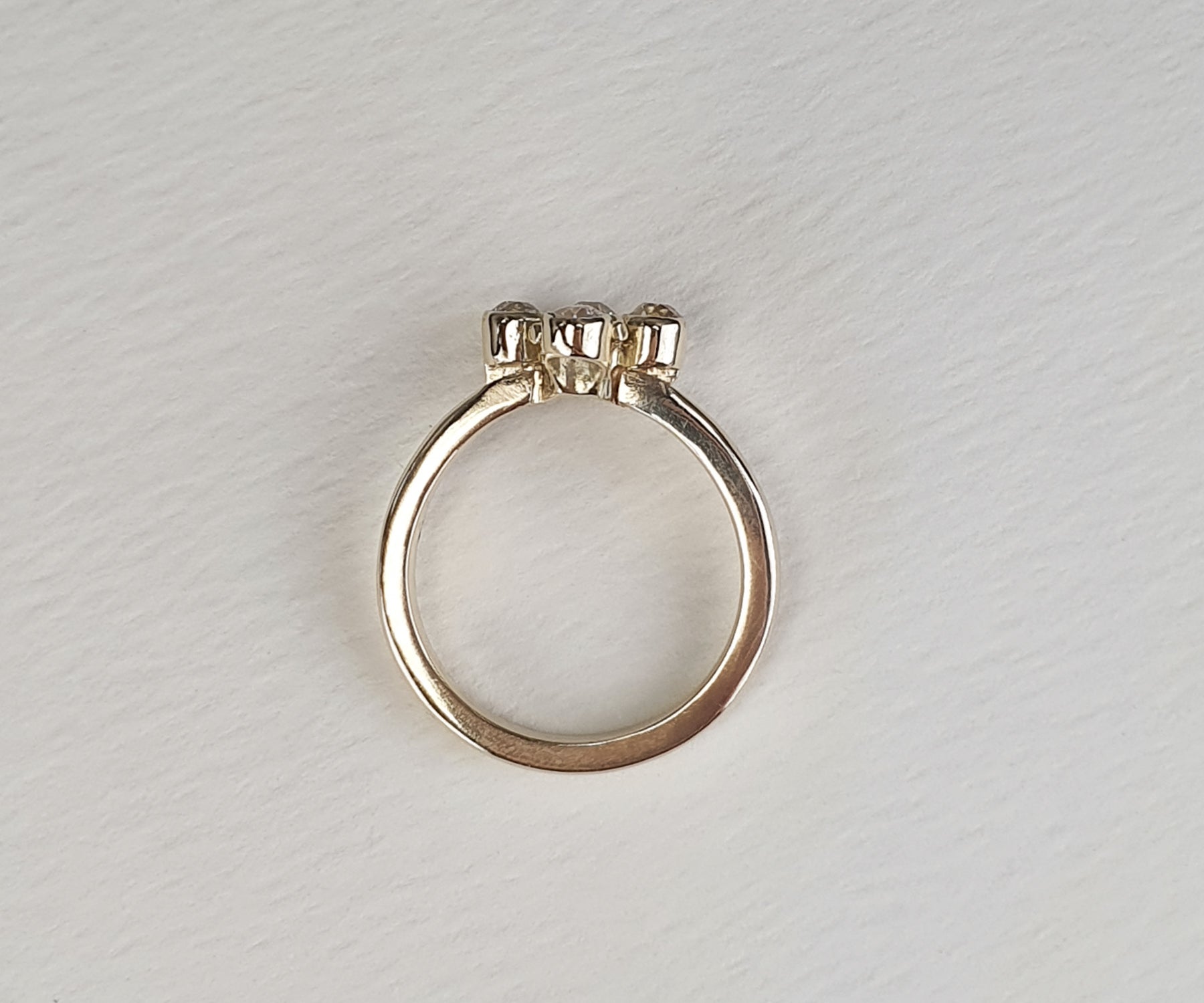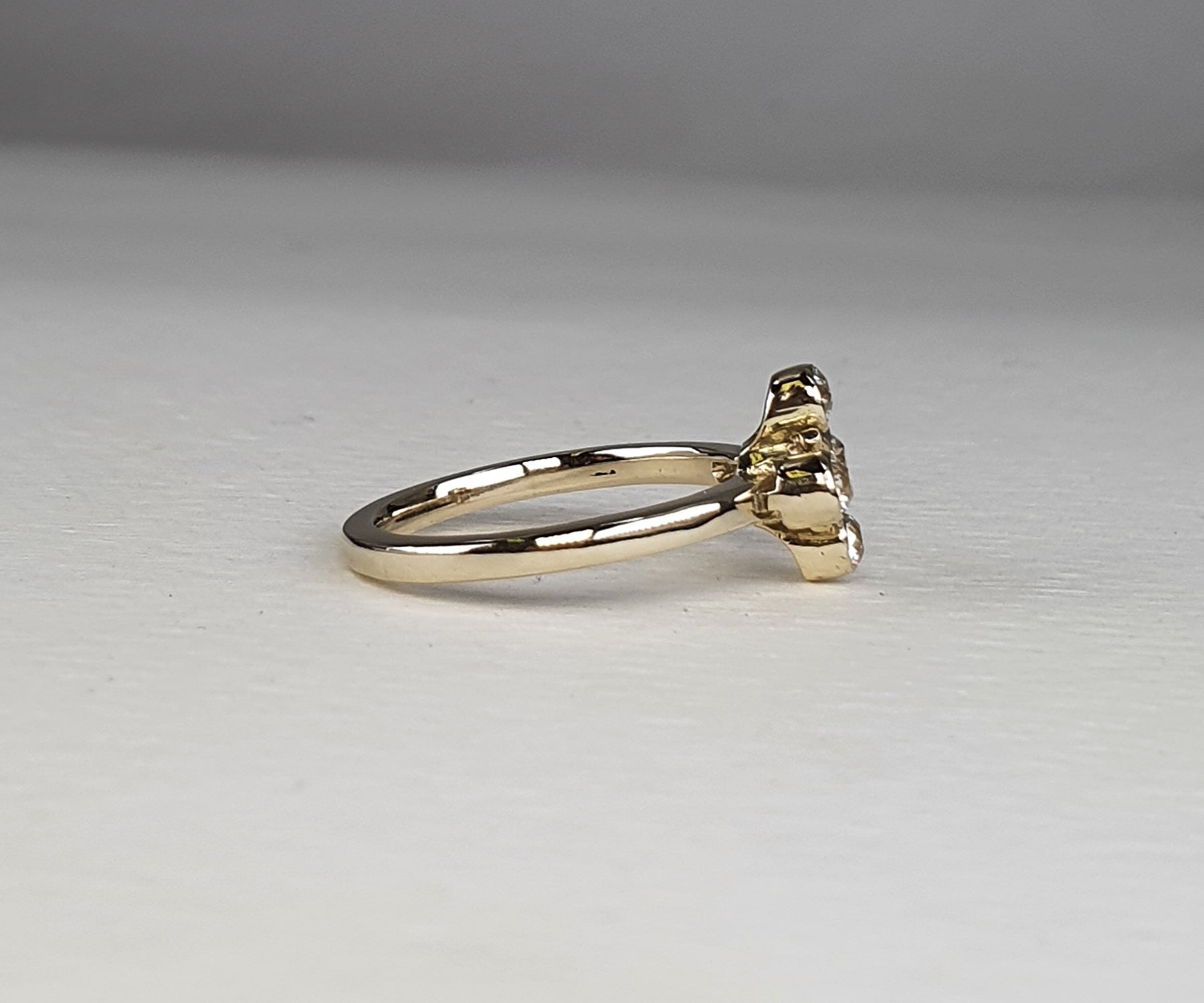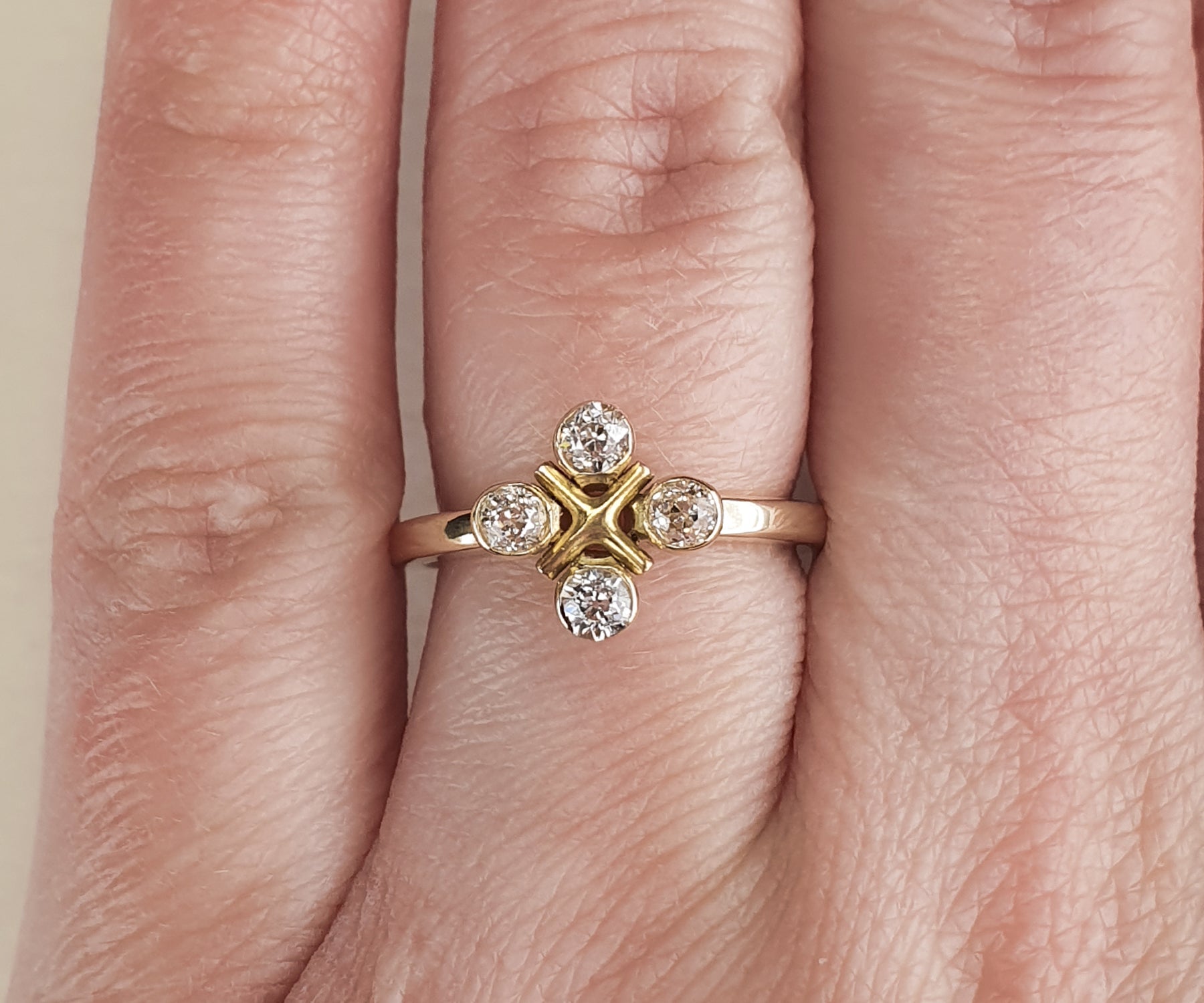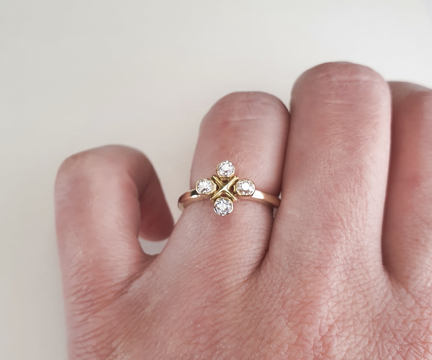 Materials: the Victorian portion (crown) of the ring is 15c yellow gold, the shank is 14ct recycled gold, four old cut diamonds.