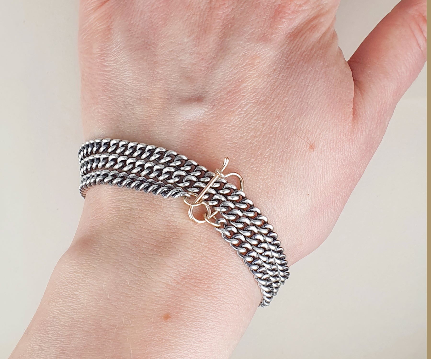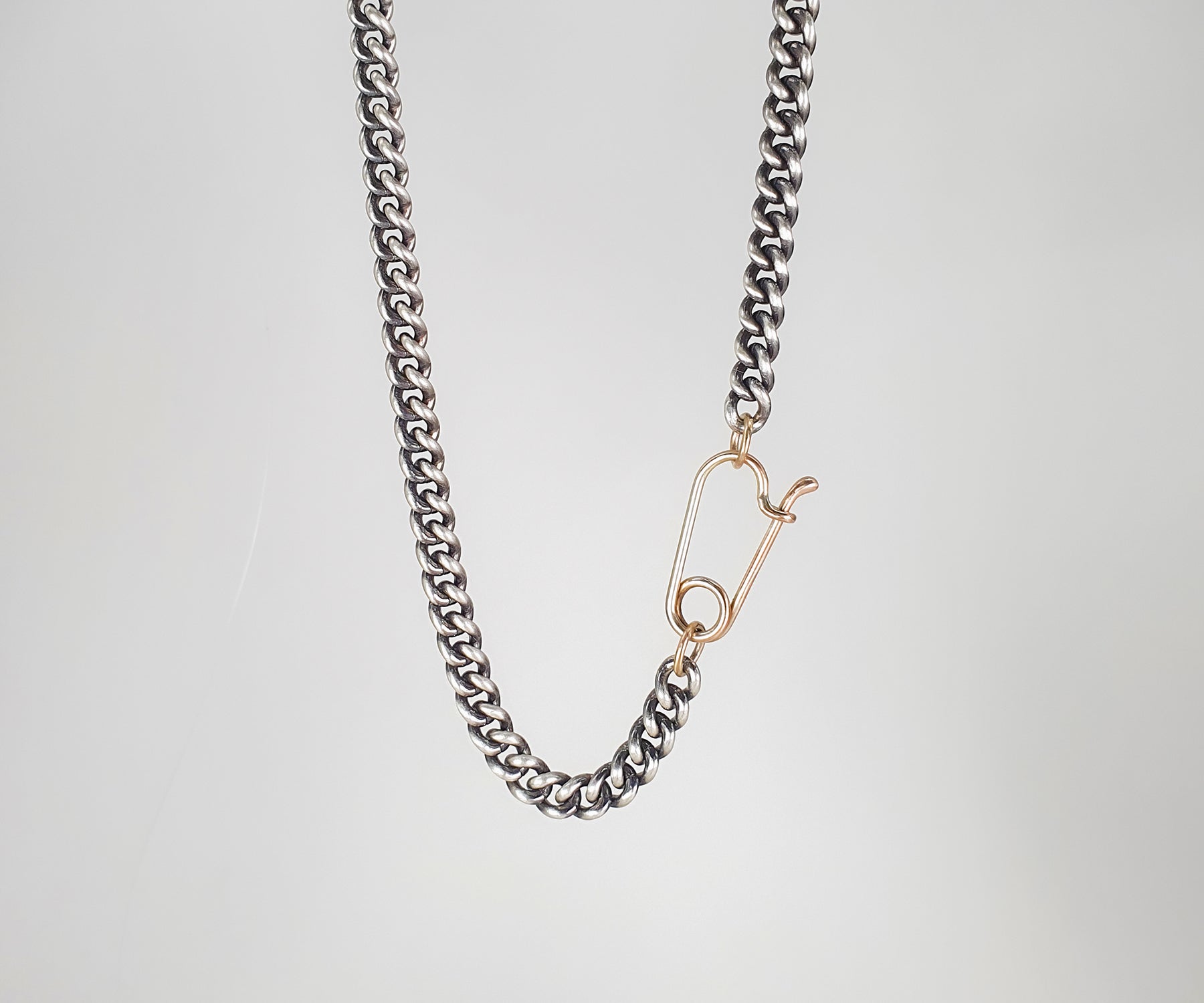 Oxi chain in sterling silver was made to look like an antique chain - with only slight patination and a soft sheen. It is bound to change even more when worn - most certainly a desirable effect! Here it is complete with 9ct recycled gold handmade safety pin and jump rings.