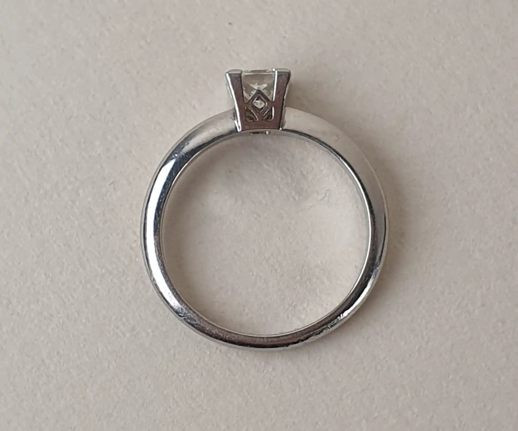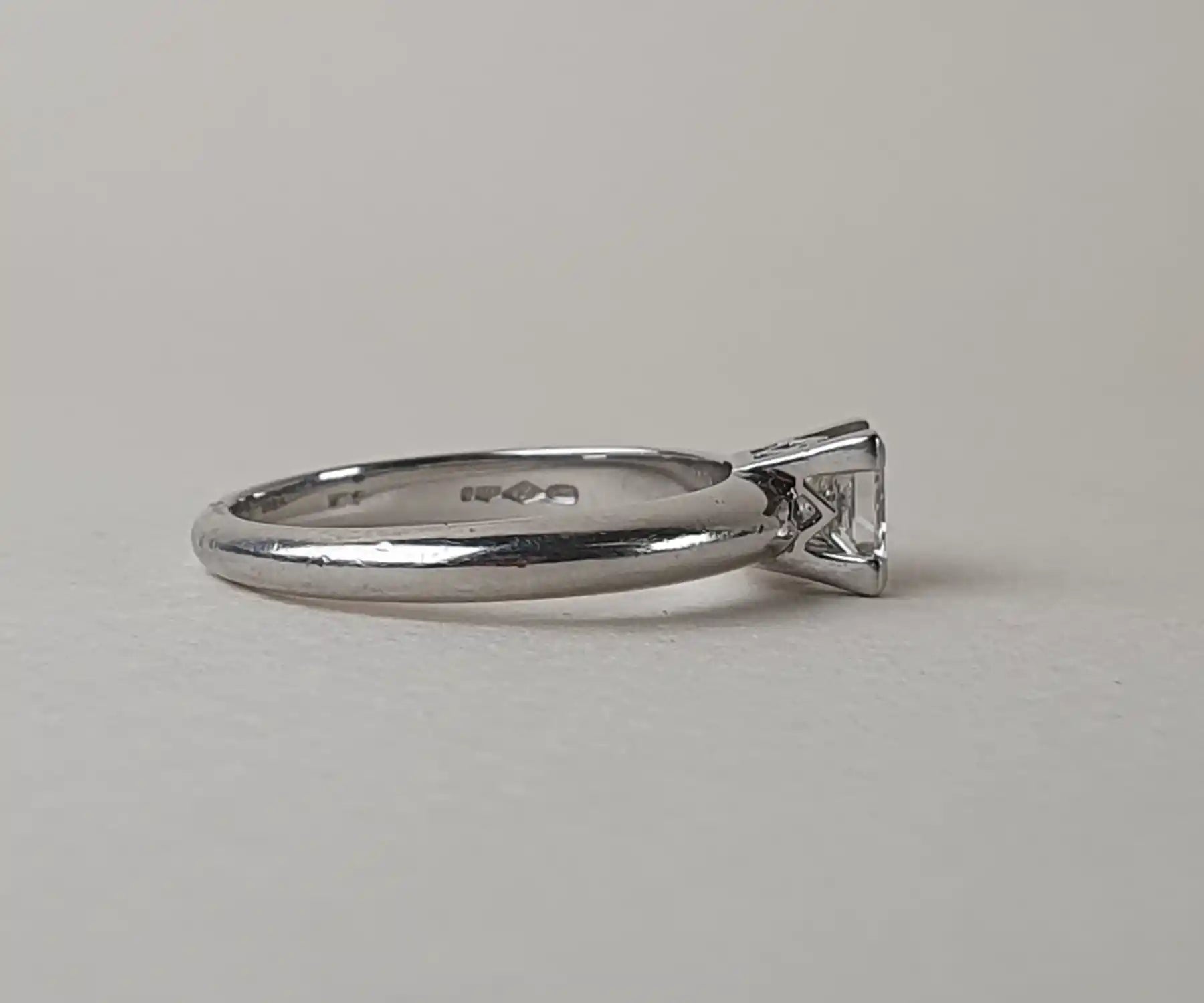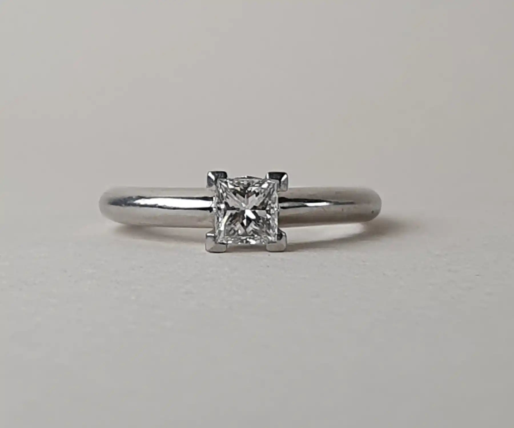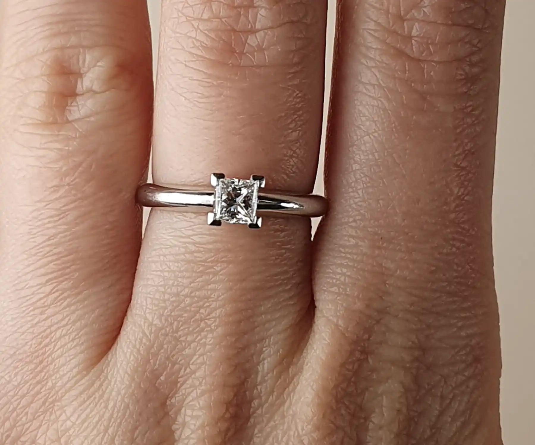 Lovey minimalist single-stone engagement ring, featuring a 0.44ct princess cut natural diamond of VS clarity and G-H colour. The setting has four angular-shaped claws holding the stone and an interesting lozenge shape open work feature - that could accommodate a small diamonds if you'd wish to embellish the ring more! The shank is very sturdy - it tappers down away from the shoulders from 2.80mm to 2.10mm.