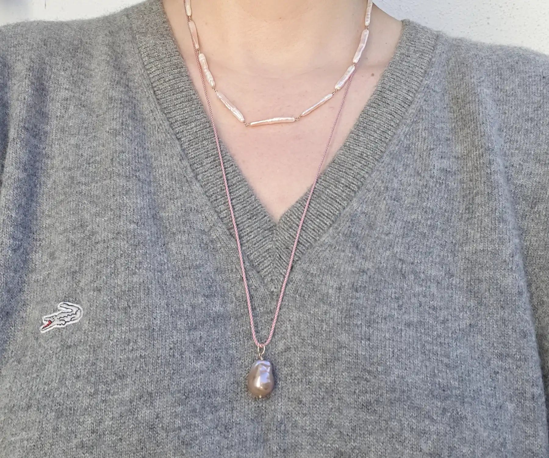 Stunning purple baroque with incredible iridescent lustre - finally available as a pendant! This pendant also comes as a necklace - available with a thick natural silk cord or a 9ct yellow gold chain.