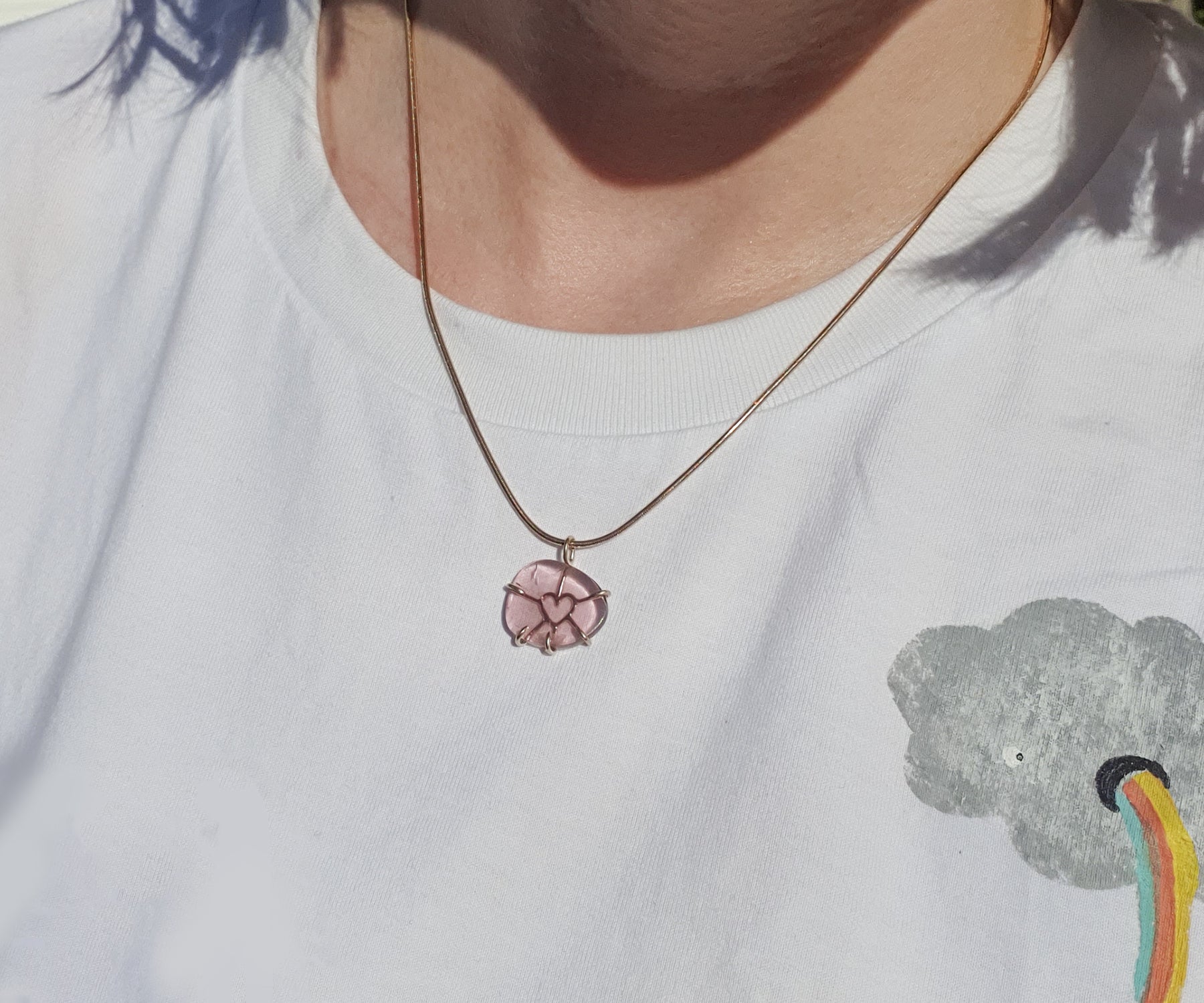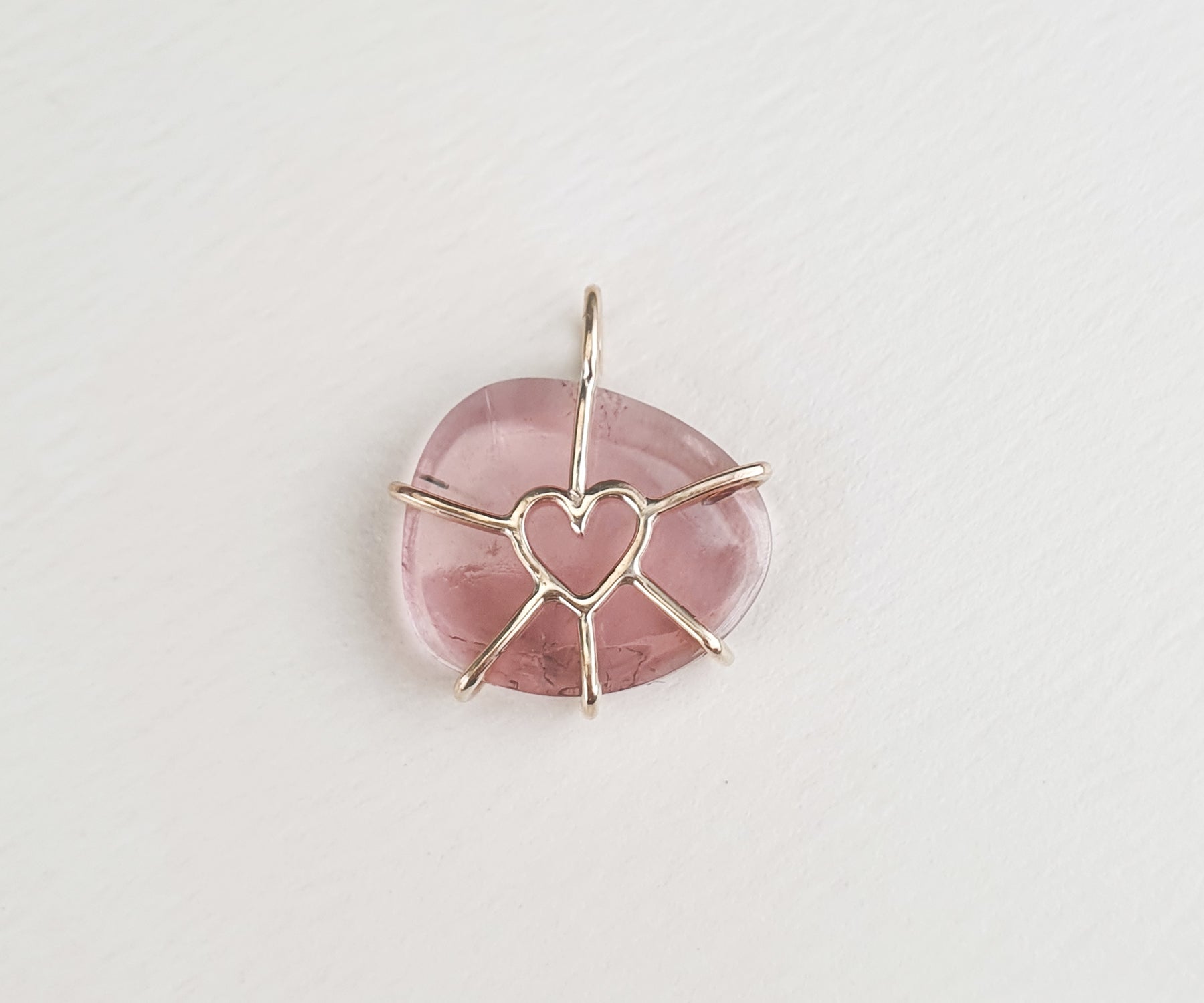 The candy pink tourmaline slice has a little rainbow surprise - its natural internal fissure creates an iridescent effect when tilted - and that is why we love stone inclusions - they have a surprising joyful side to them.