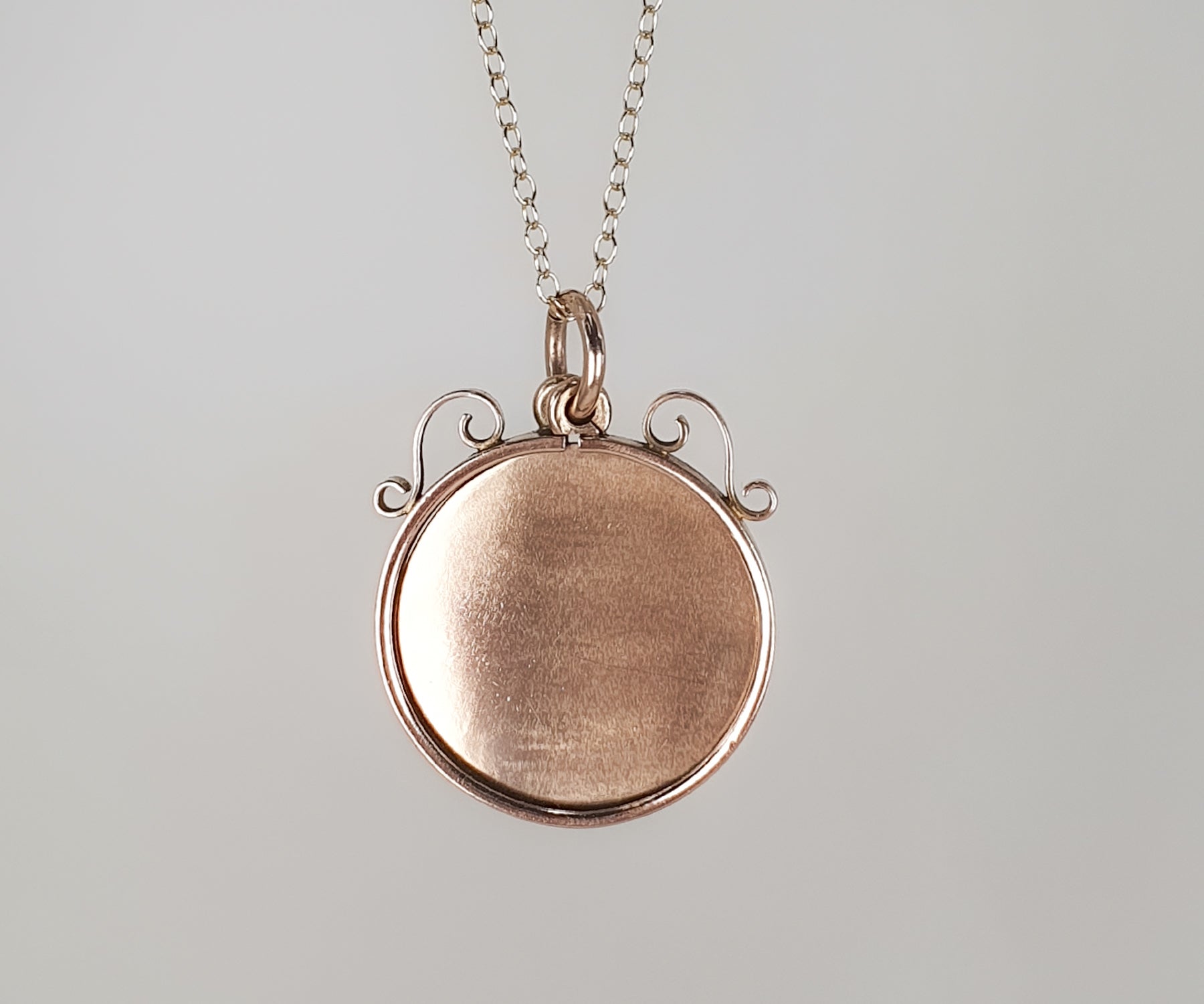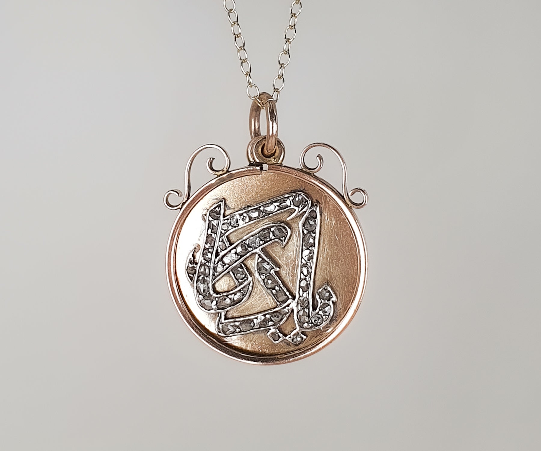Attractive, gold and silver pendant with rose-cut diamonds that form the word 'Remember' in Urdu. The Victorian 9ct frame is not an original setting for the coin/token which in all probability was to be a stand-alone piece. The frame can be removed, by opening the jump ring. The silver and diamond inscription is missing three diamonds but is in overall amazing condition. The provenance of this piece is unknown.