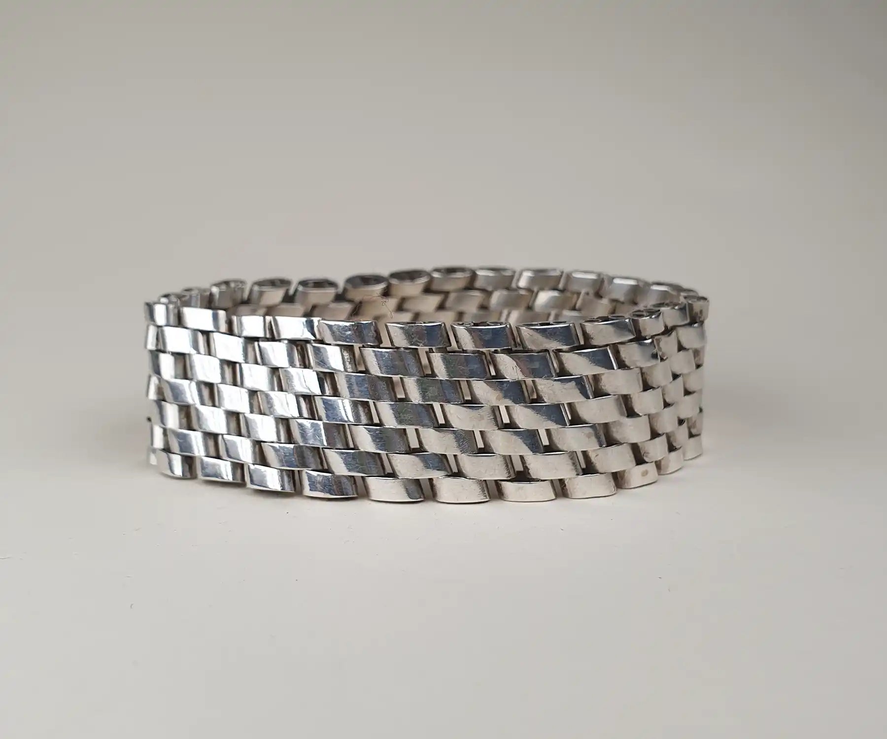 Chunky-looking, yet incredibly comfortable silver vintage bracelet. Even with its decent weight, this bracelet is like a comforting blanket, a complete pleasure to wear. The slanted jubilee design - simple and elegant, would suit literally anyone. With a nicely crafted tension clasp that is seamless, this is a perfect piece of jewellery for any occasion.