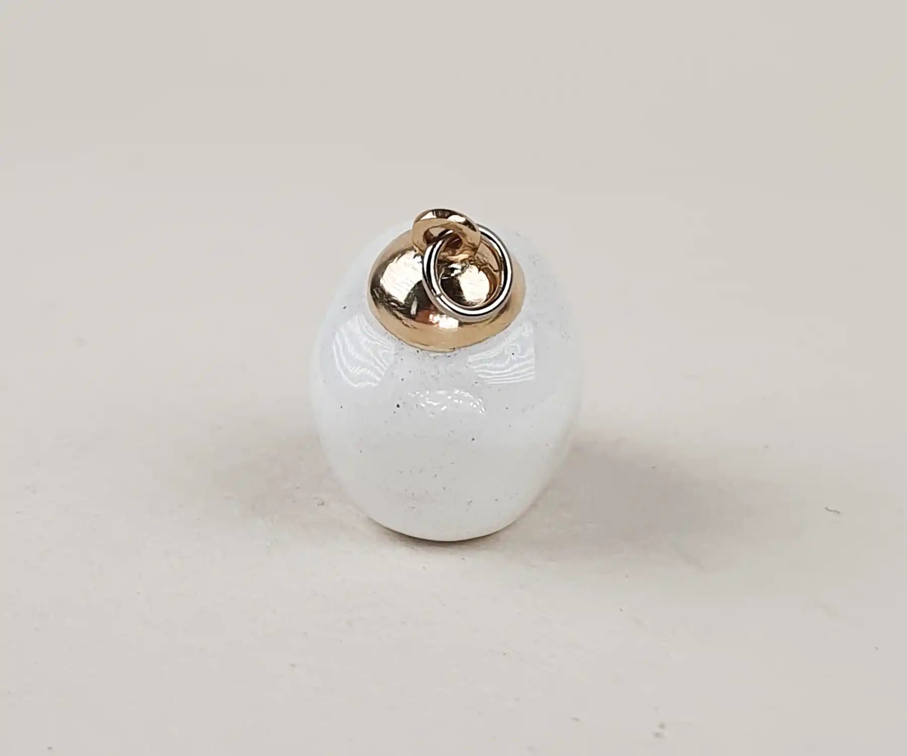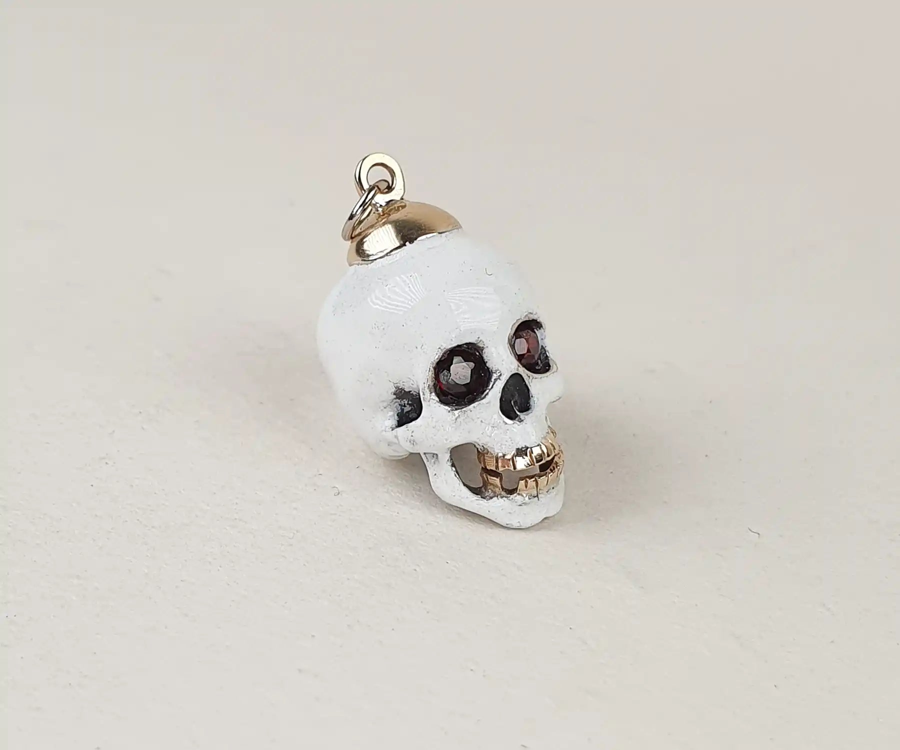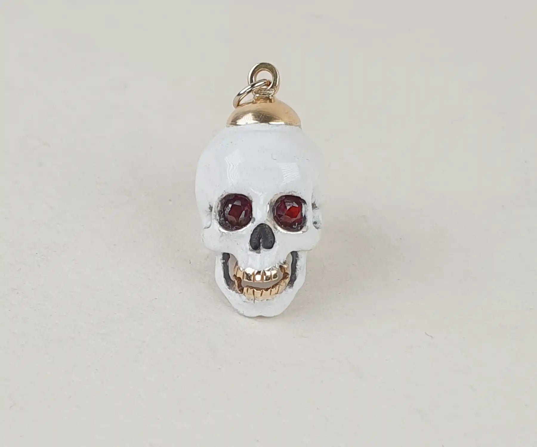 Antique White Enamel Skull Pendant with Garnet Eyes and Gold Teeth